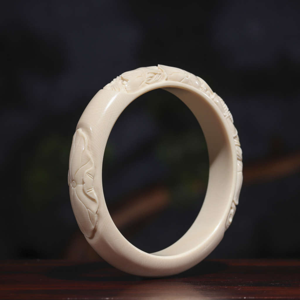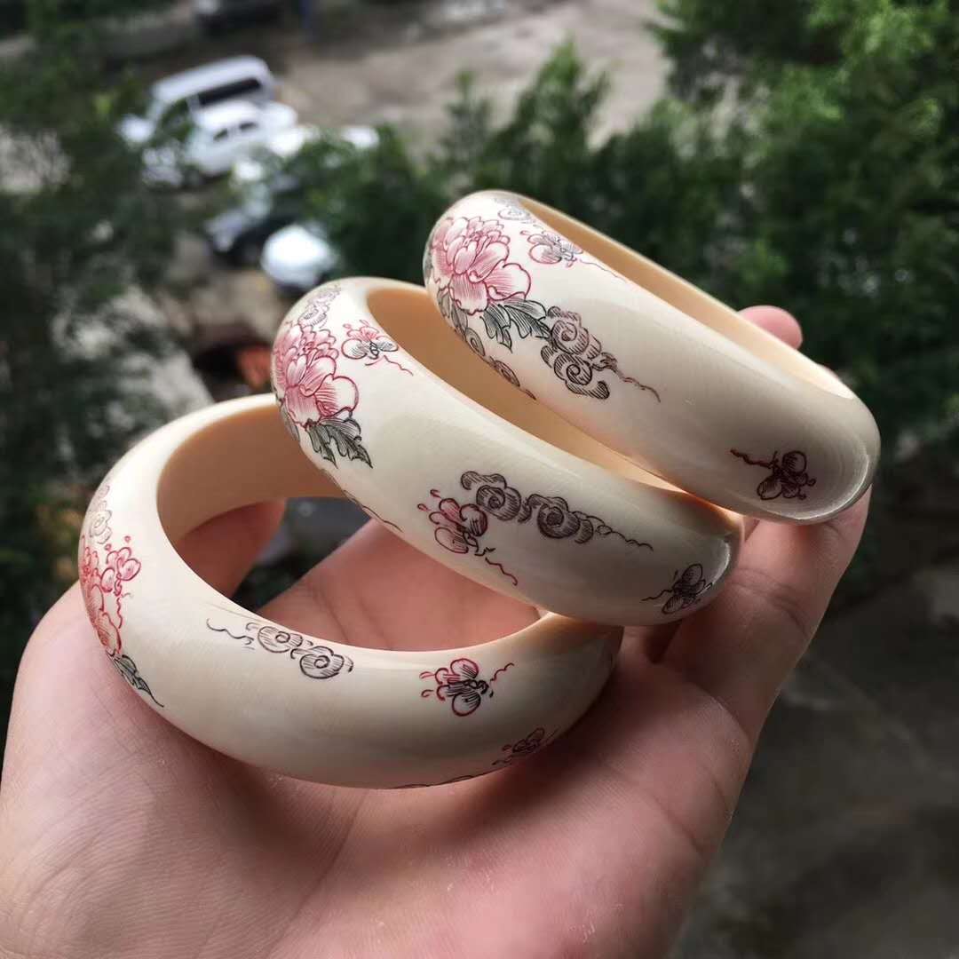 猛犸象牙精品蝶戀花彩繪手鐲,2.0cm貴妃刻花手鐲。極品滿紋冰料,水潤十足¥.00 -