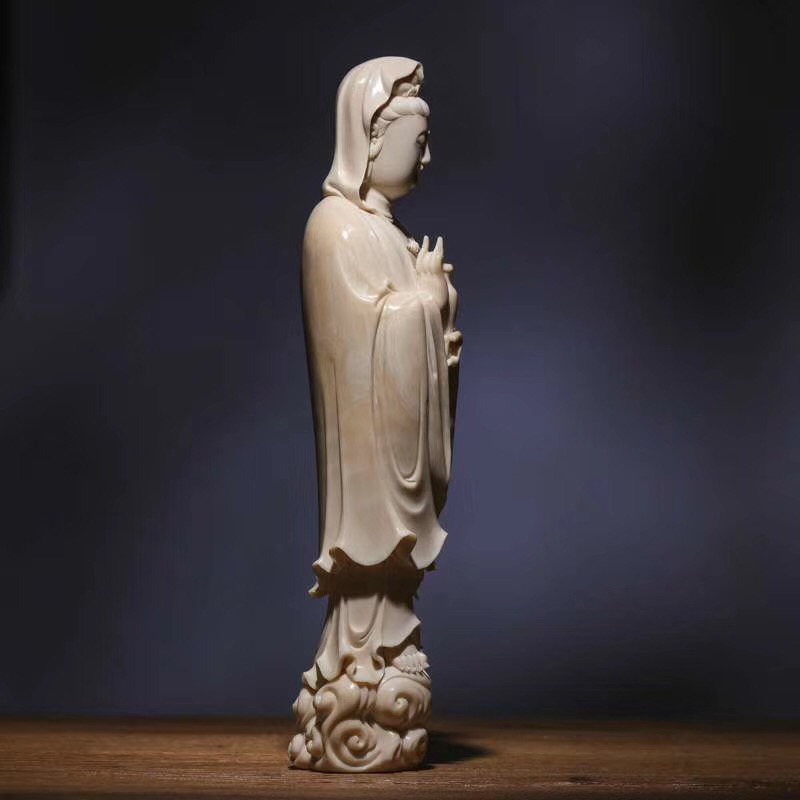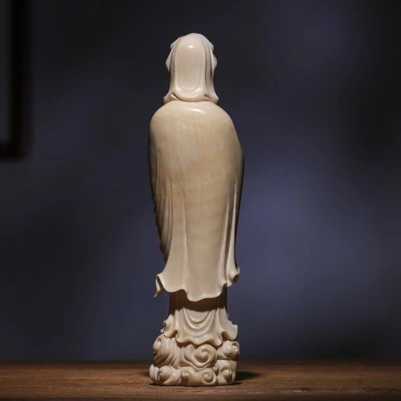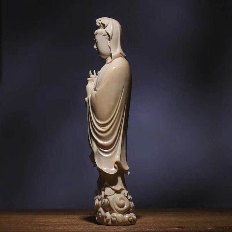 觀音擺件,莆田工藝,觀音開臉慈祥,經典之作。選料上乘,精雕細啄,刀法精湛,如庖丁解牛,順暢無比,令人賞心悅目,盡顯大師級非凡手藝。尺寸:260x65x55mm,重:770g