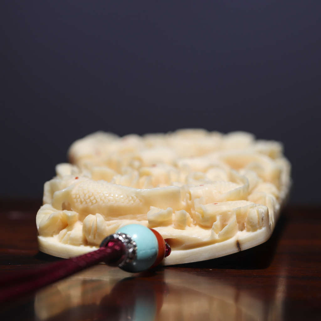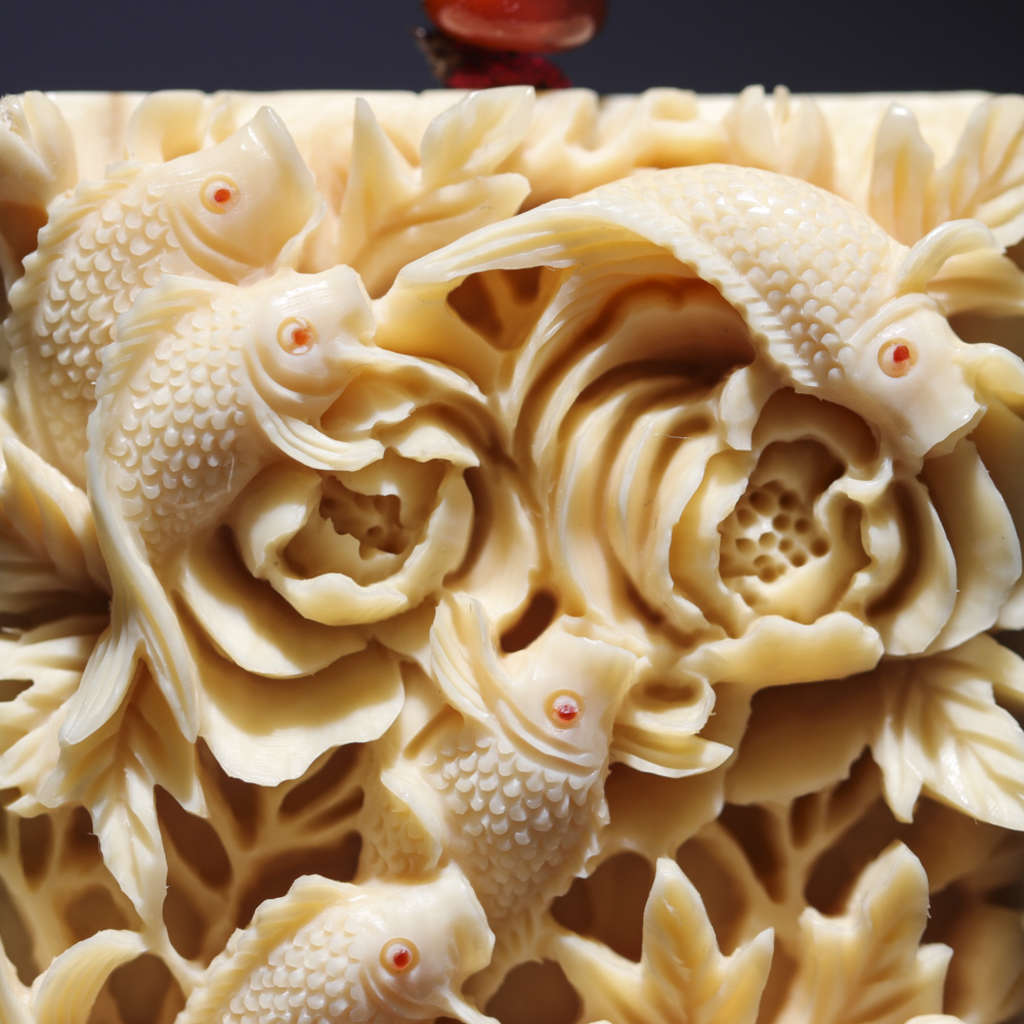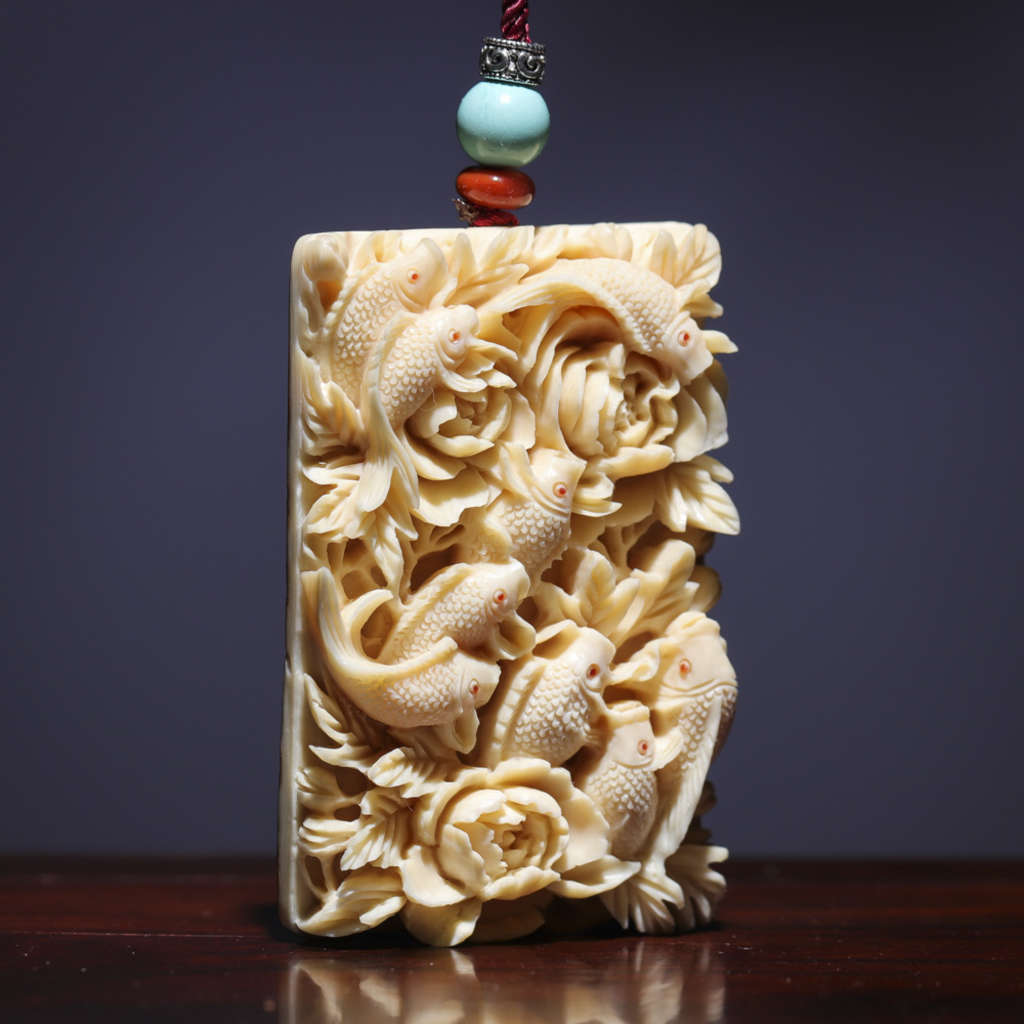【猛犸牙雕作品】《九鯉富貴》,鯉魚牡丹皆為吉祥富貴的象征,寓意招財進寶、富貴吉祥。同時亦有鯉魚逆流前進、躍門化龍之說,寓意升官發(fā)財、飛黃騰達。精選猛犸帶皮冰料!料子潤澤,紋路清晰,老師傅純手雕刻,細節(jié)完美!