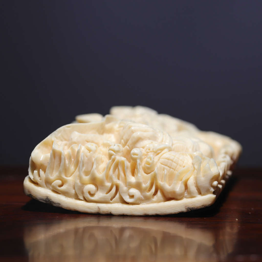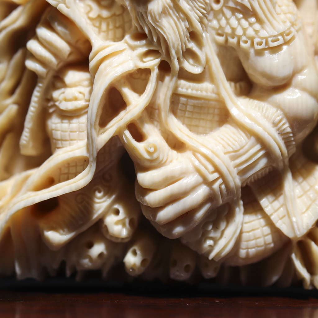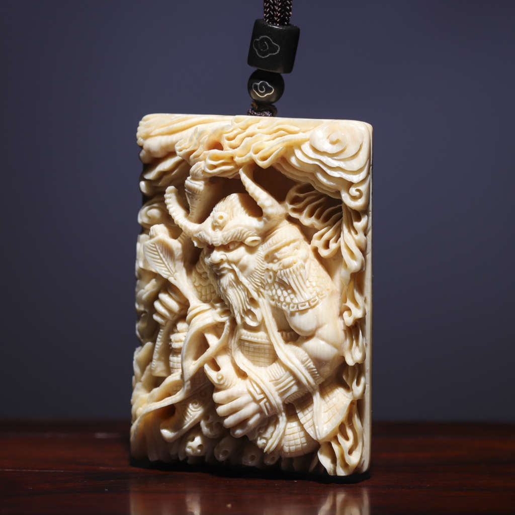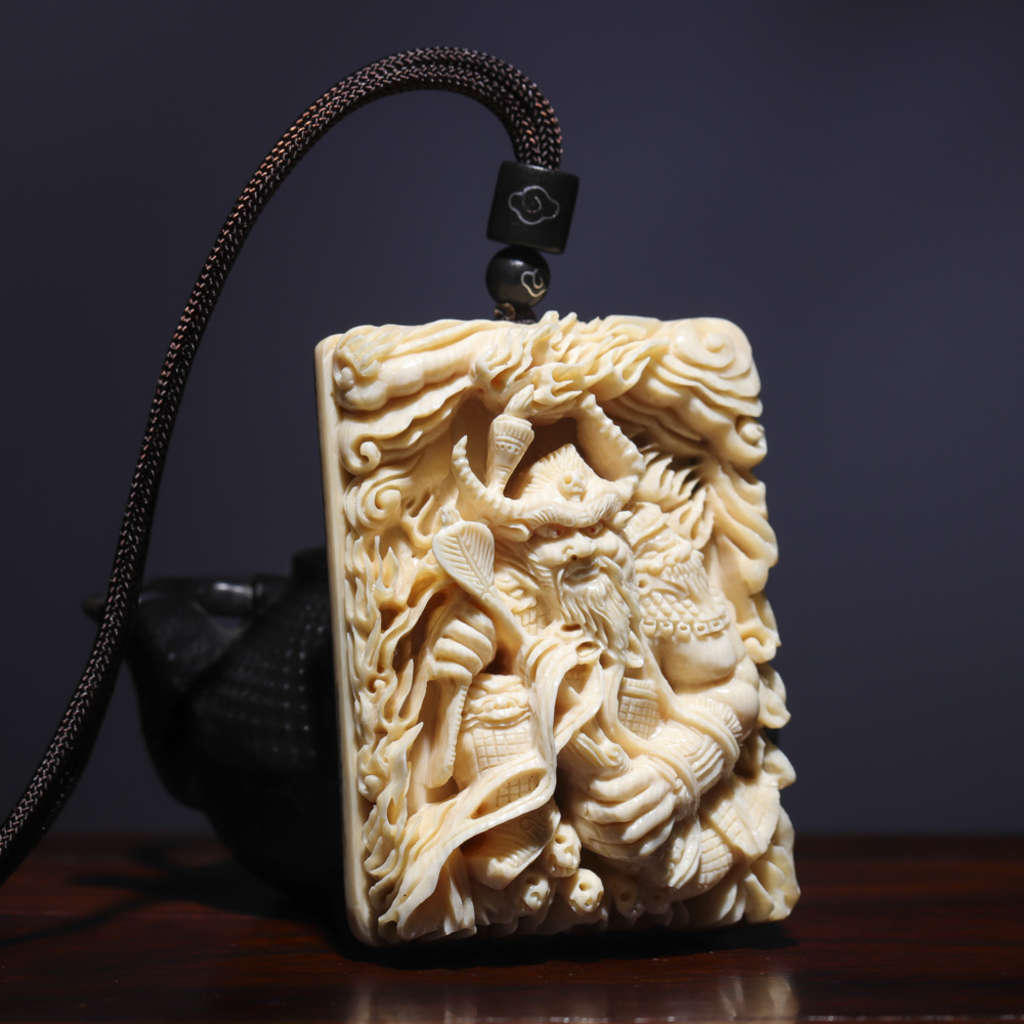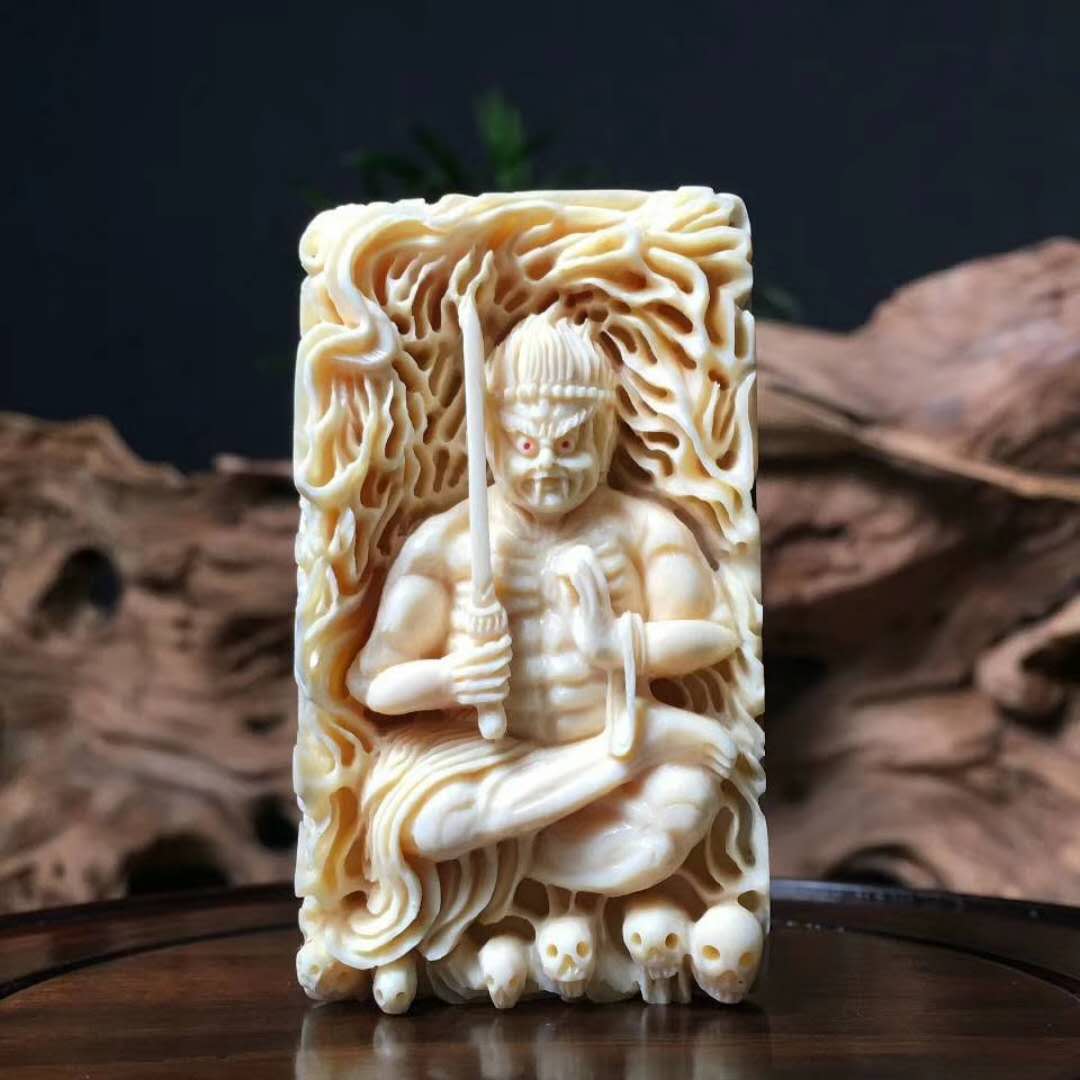 【猛犸牙雕作品】《牛魔王》,資深老師傅創作款!題材新穎,雕工精湛細膩。牛魔手持火把與芭蕉扇,神態傳神,意境絕佳!料子紋路飽滿,質感潤澤,背面金皮滄桑古樸,韻味十足!