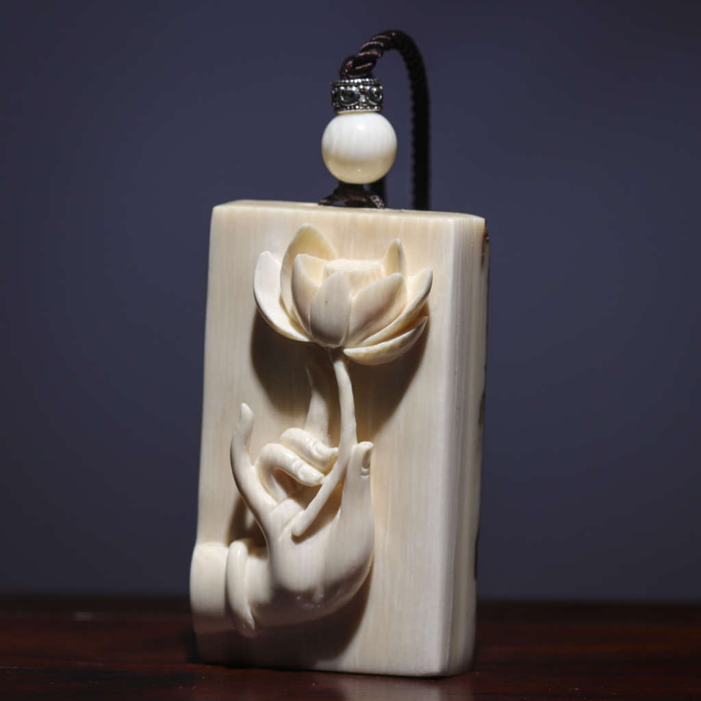 【猛犸牙雕作品】《阿彌陀佛》,精選上乘猛犸冰料!設計精巧,雕工細膩!正面手工鑲嵌綠松、南紅,十分漂亮。背面雕刻有六字真言蓮花祥云,驅邪辟兇、吉祥如意!