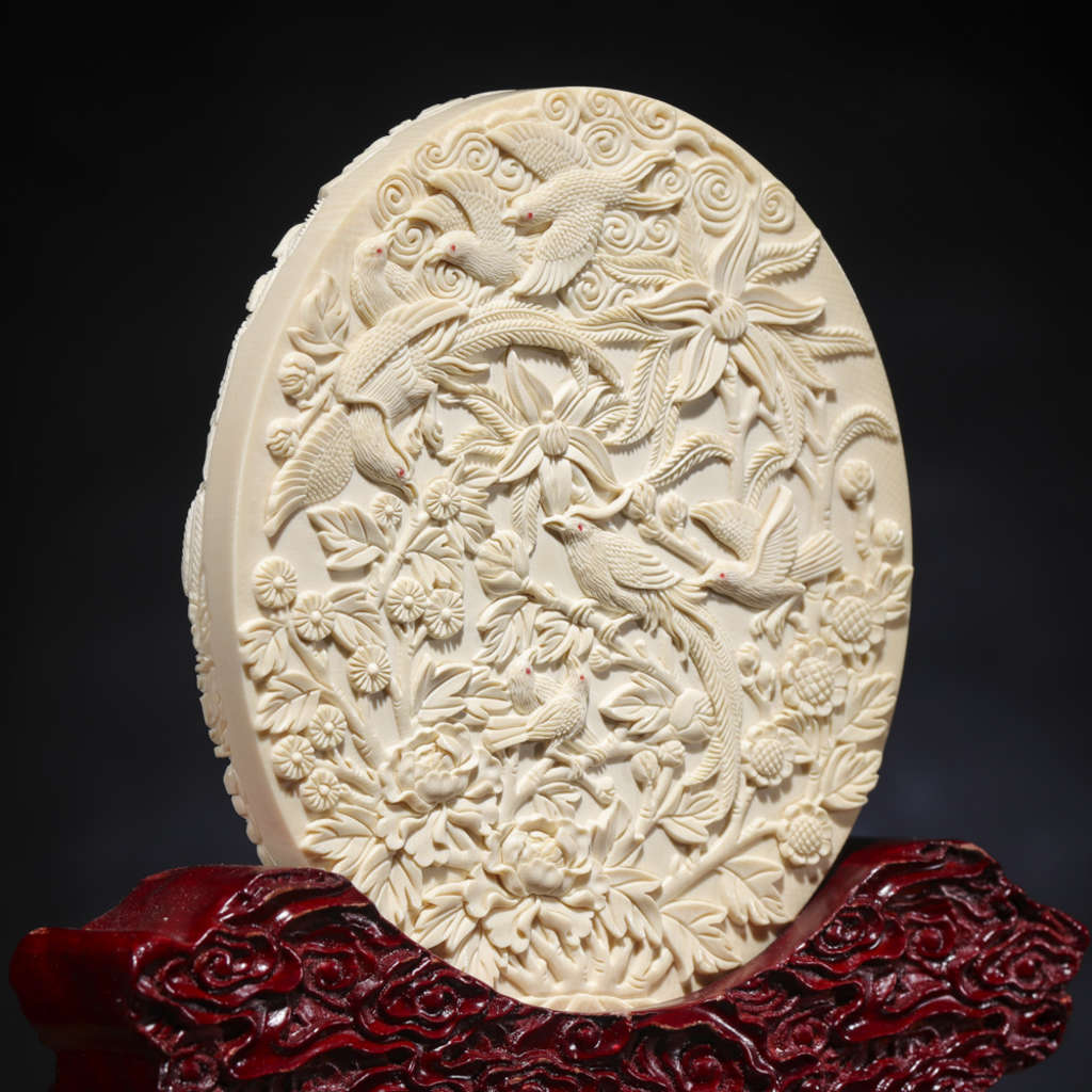 優質擺件!【猛犸牙雕作品】《百鳥朝鳳》,精選上乘白冰料!整體雕工流暢細膩一氣呵成!花鳥細節的處理相當精致,千姿百態,宛若要飛躍而出,靈性十足。是一件非常適合擺放鑒賞的佳作! 百鳥合鳴,生機勃勃,幸福吉祥!收藏送禮都非常適用!