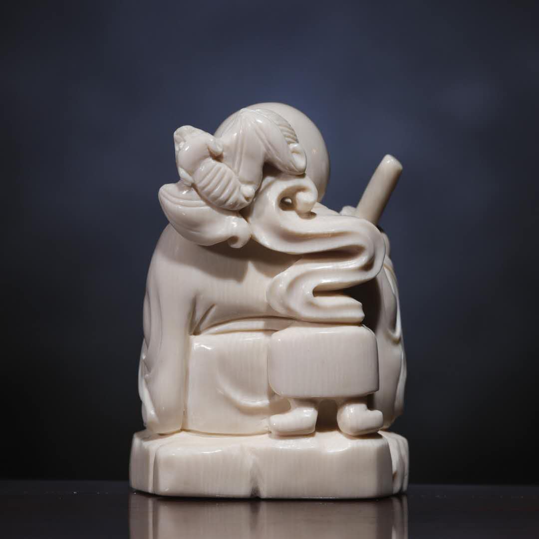 猛犸象牙《小書童》細節(jié)刻畫生動活潑,線條靈動俏皮,整個形象活靈活現(xiàn),靈性十足!小書童,奮發(fā)圖強,背有蝙蝠落下,寓意福氣滿滿、事事順利。