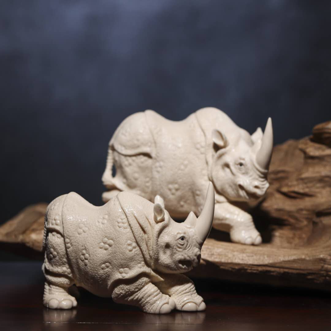 犀牛對擺,牙質冰透水潤,純手工滿工精雕,去料多。細膩精湛,紋理清晰,大師手工,線條流暢,栩栩如生。可擺放于家中、辦公室。寓意鎮宅辟邪,事業紅火。尺寸:71x50x28mm,66x45x26mm,對重:127.7g.4200