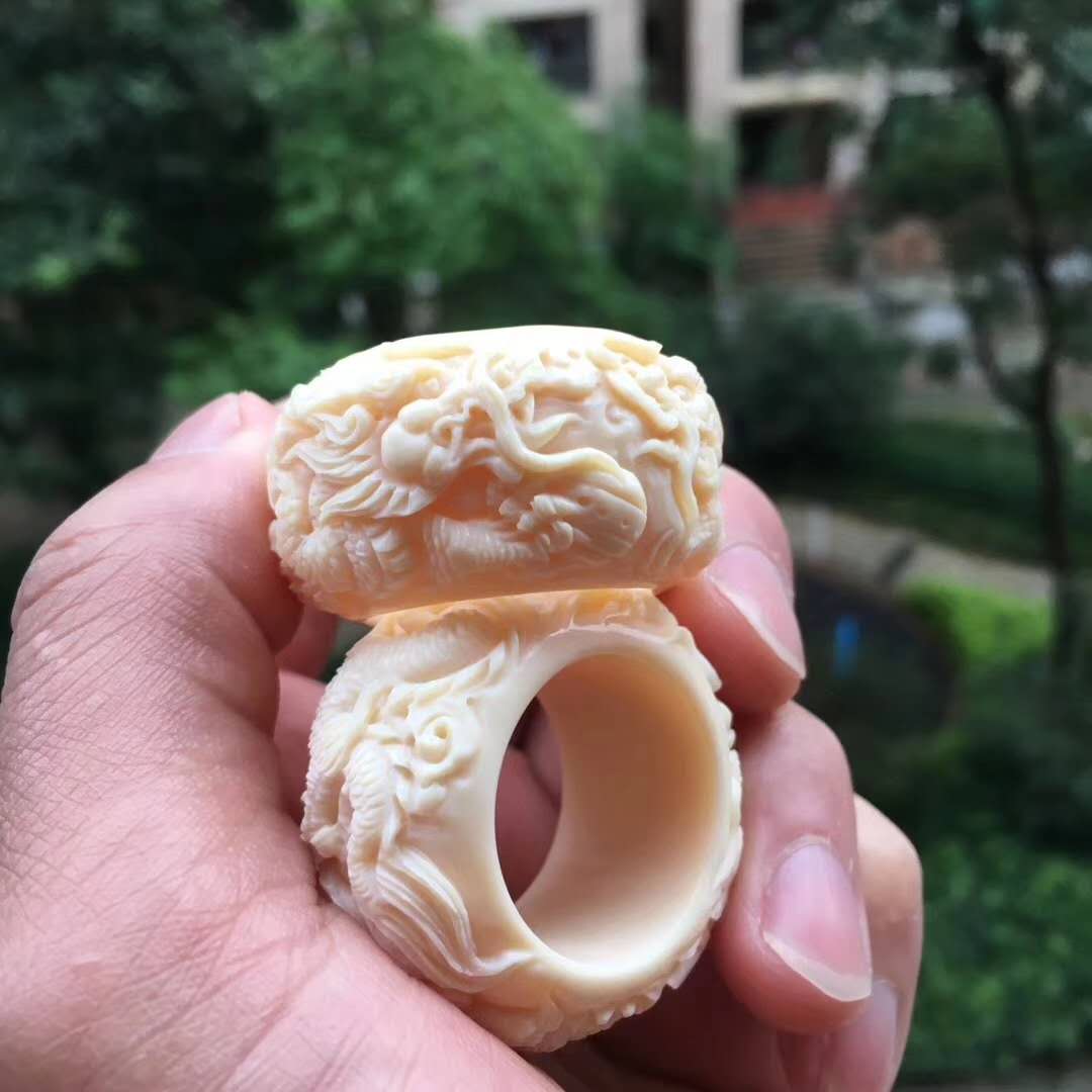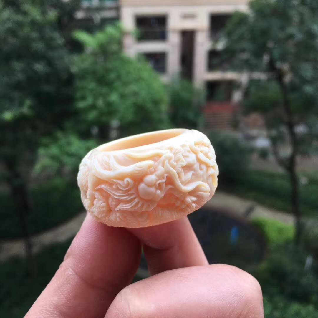 雙龍戲珠執掌天下,環繞式立體浮雕滿工扳指配飾,全果凍料肉色水潤無比,純手工雕琢。圈口20~24mm,約17g