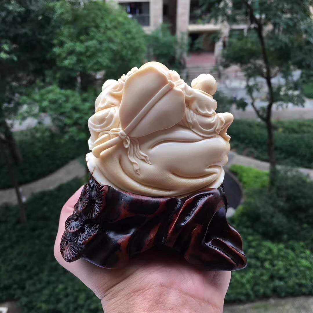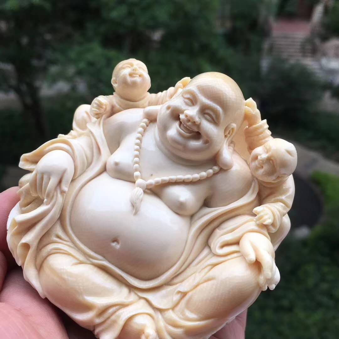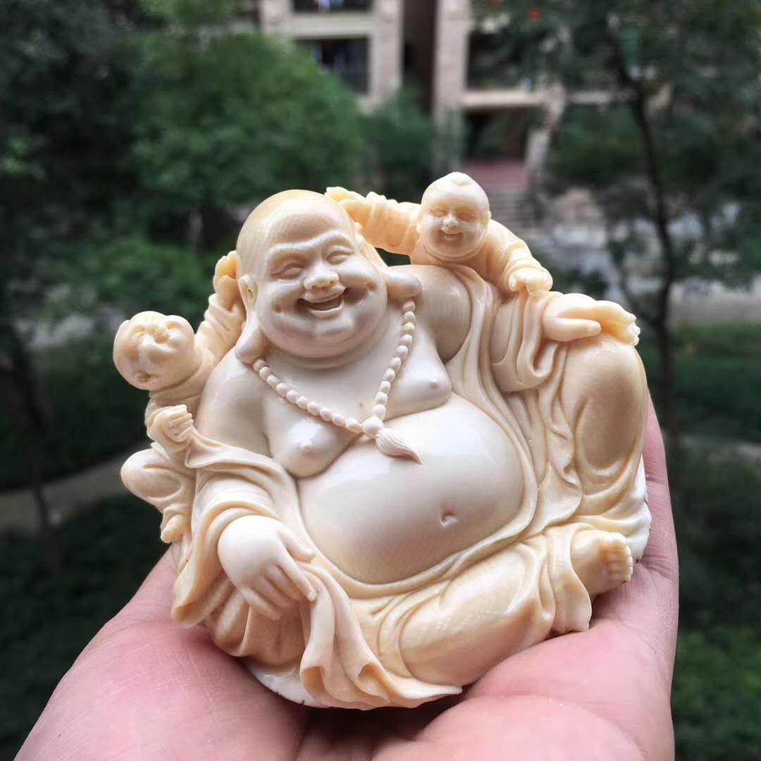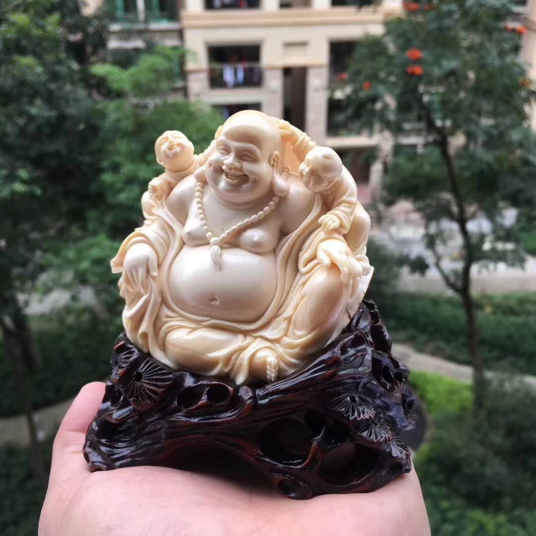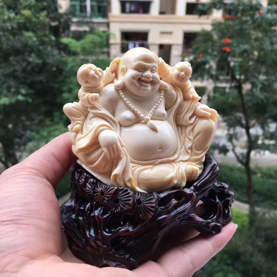 猛犸象牙雕雙子笑佛,收藏級小佛擺件。天工緣作,簡潔溫潤,佛態祥和栩栩如生。雙童嬉戲玩耍自在快樂。整料圓雕配手工實木底座。78×73×53mm,234g