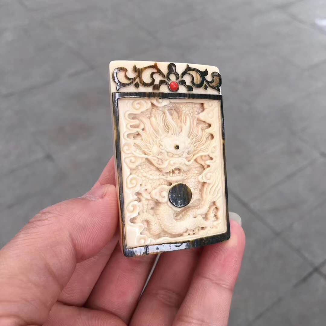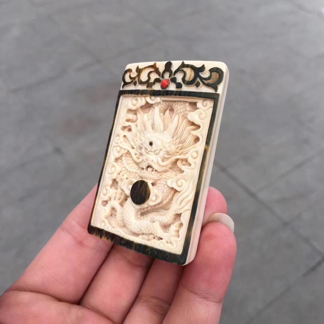 猛犸牙雕天然俏色藍皮金龍吐瑞雕件,原皮巧雕霸氣龍牌,肉色冰潤紋路清晰自然,鑲嵌紅珊瑚浮雕古紋圖案,祥瑞之氣撲面而來。40×60×10mm,34.6g