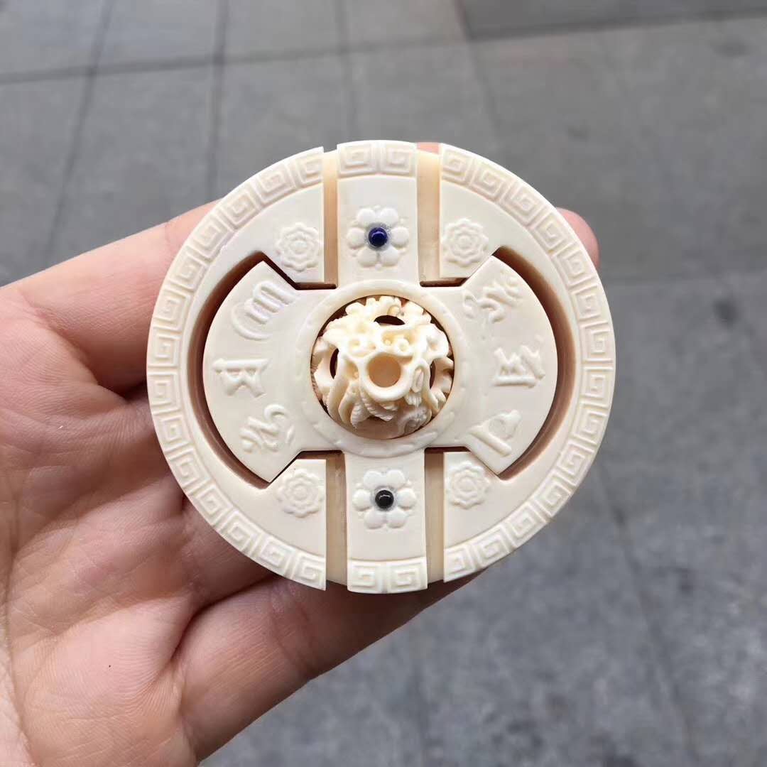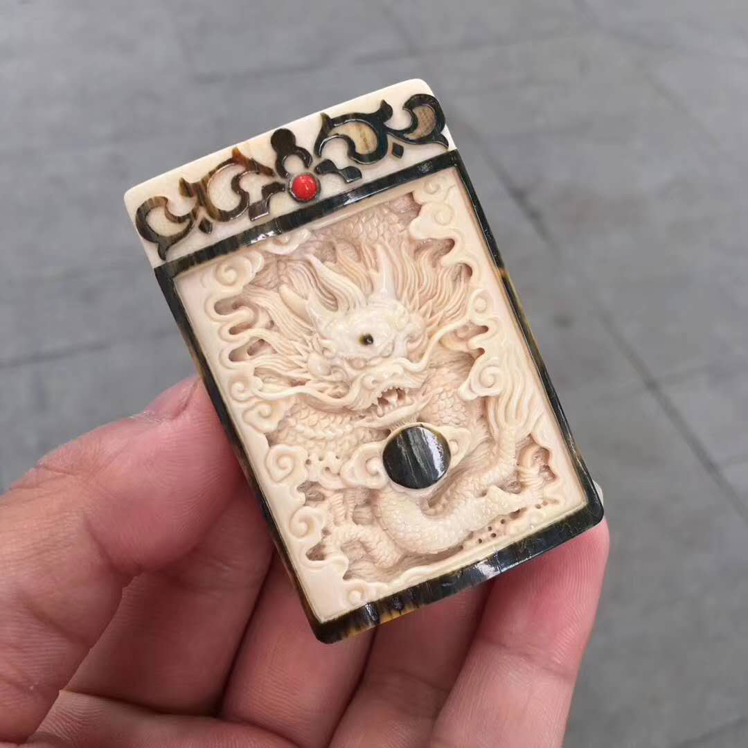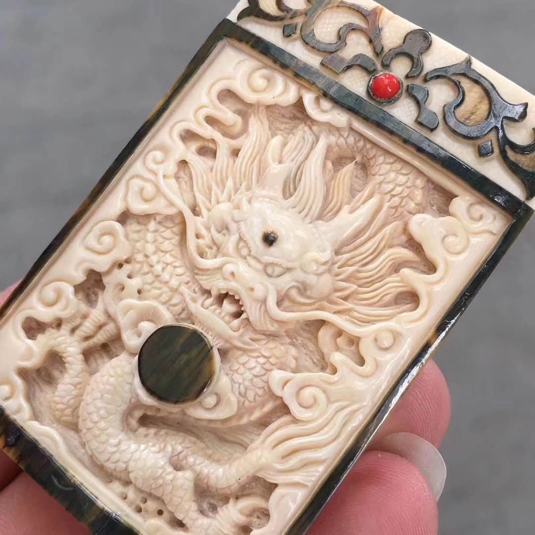 猛犸牙雕天然俏色藍皮金龍吐瑞雕件 鑲嵌紅珊瑚浮雕古紋圖案 祥瑞之氣撲面而來