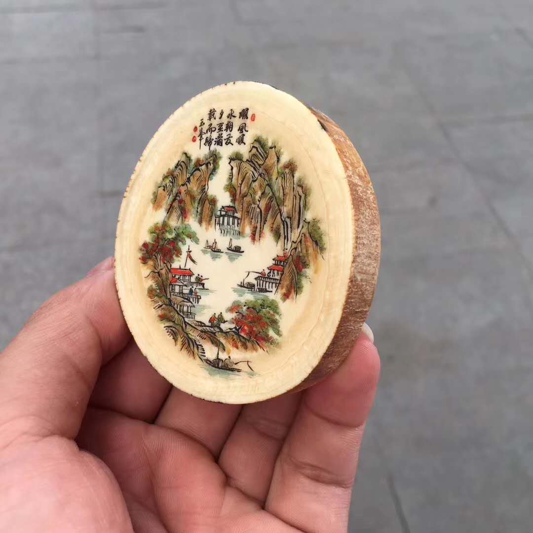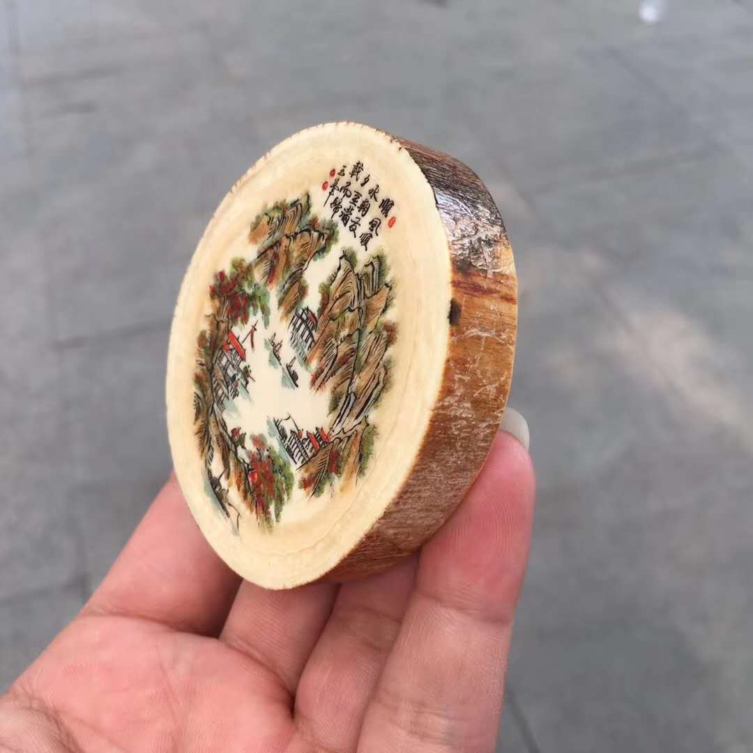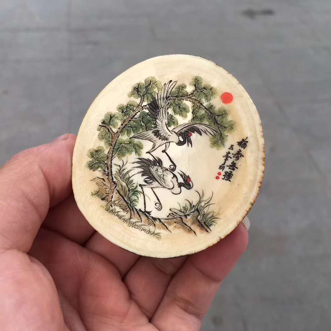 猛犸象牙雕極品原牙切餅,雙面微雕松鶴延年,皮色精美光潤,肉色冰潤滿紋小口徑適宜把玩佩戴。60×65×13mm,69.2g,價1180元