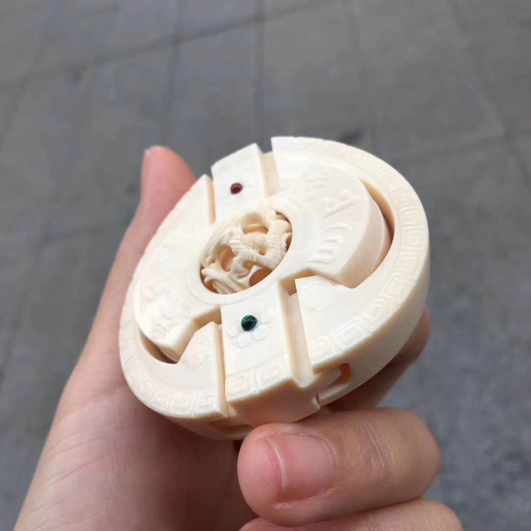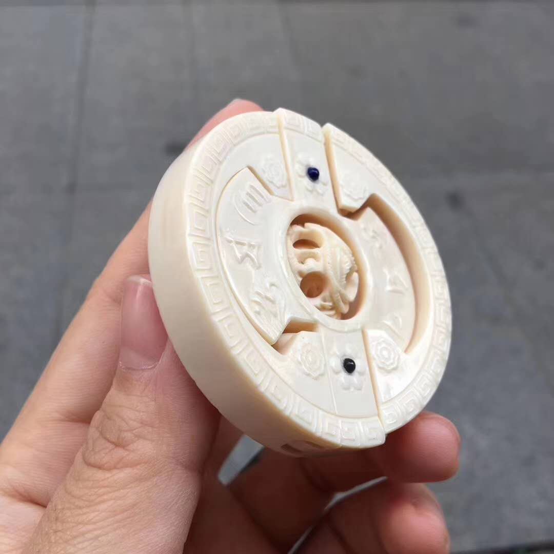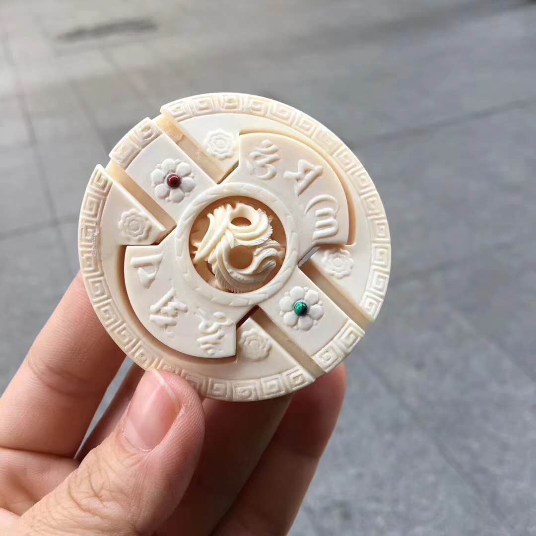 猛犸象牙六字箴言轉運圈。藏密雕刻風格。六芒星簡約大方,底紋雕刻復雜。形成鮮明對比。中間18mm鬼工玲瓏球,四周雕刻六字真言!尺寸:55.5*9.7mm,重32.6g