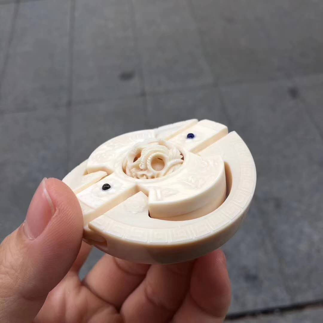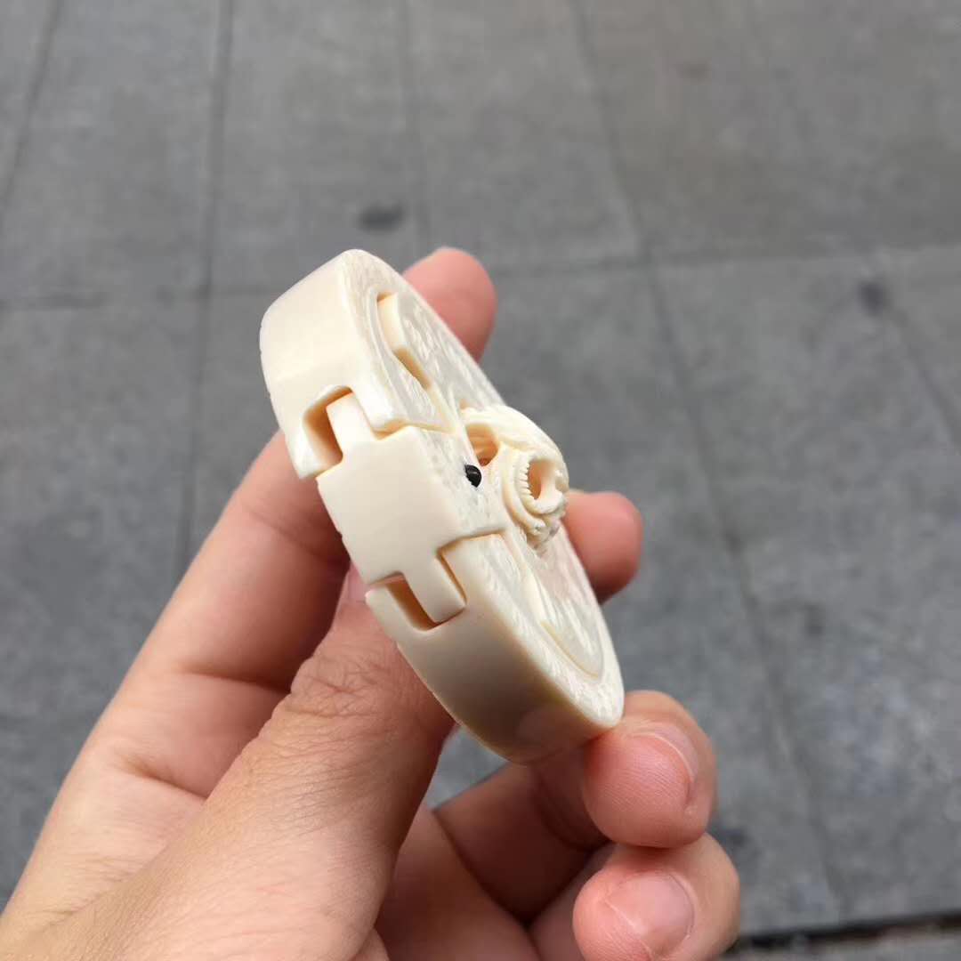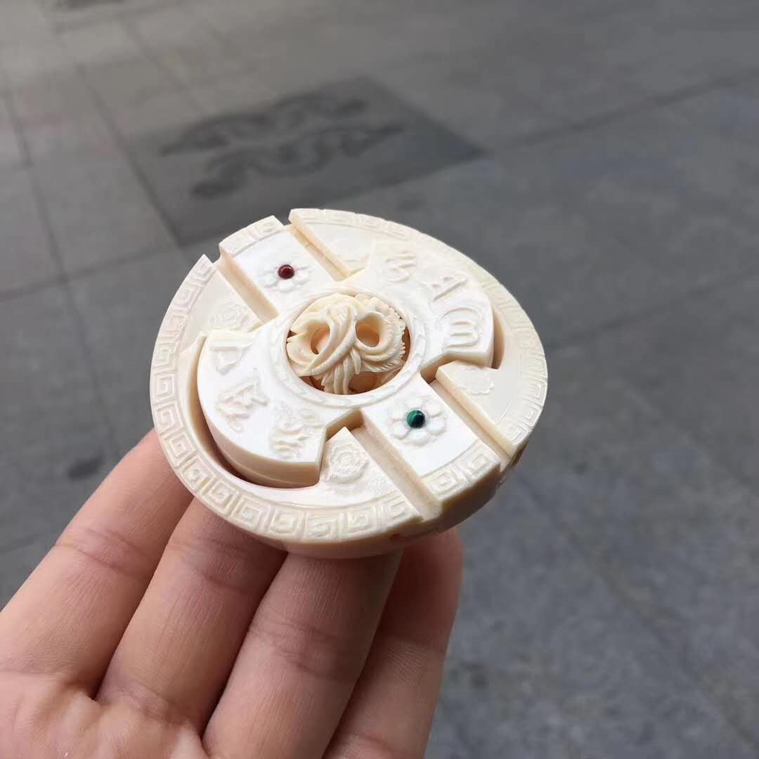 猛犸象牙六字箴言轉運圈。藏密雕刻風格。六芒星簡約大方,底紋雕刻復雜。形成鮮明對比。中間18mm鬼工玲瓏球,四周雕刻六字真言!尺寸:55.5*9.7mm,重32.6g
