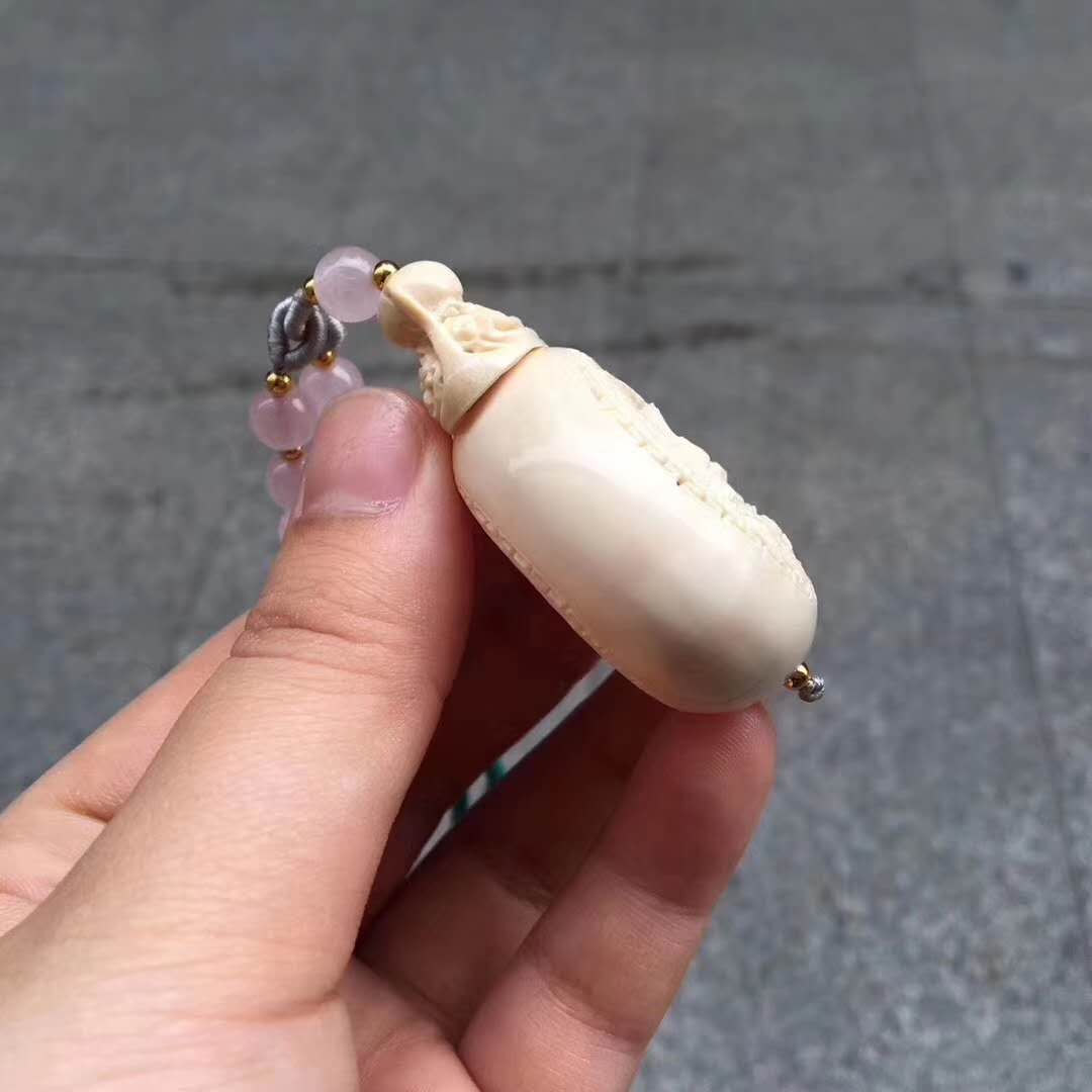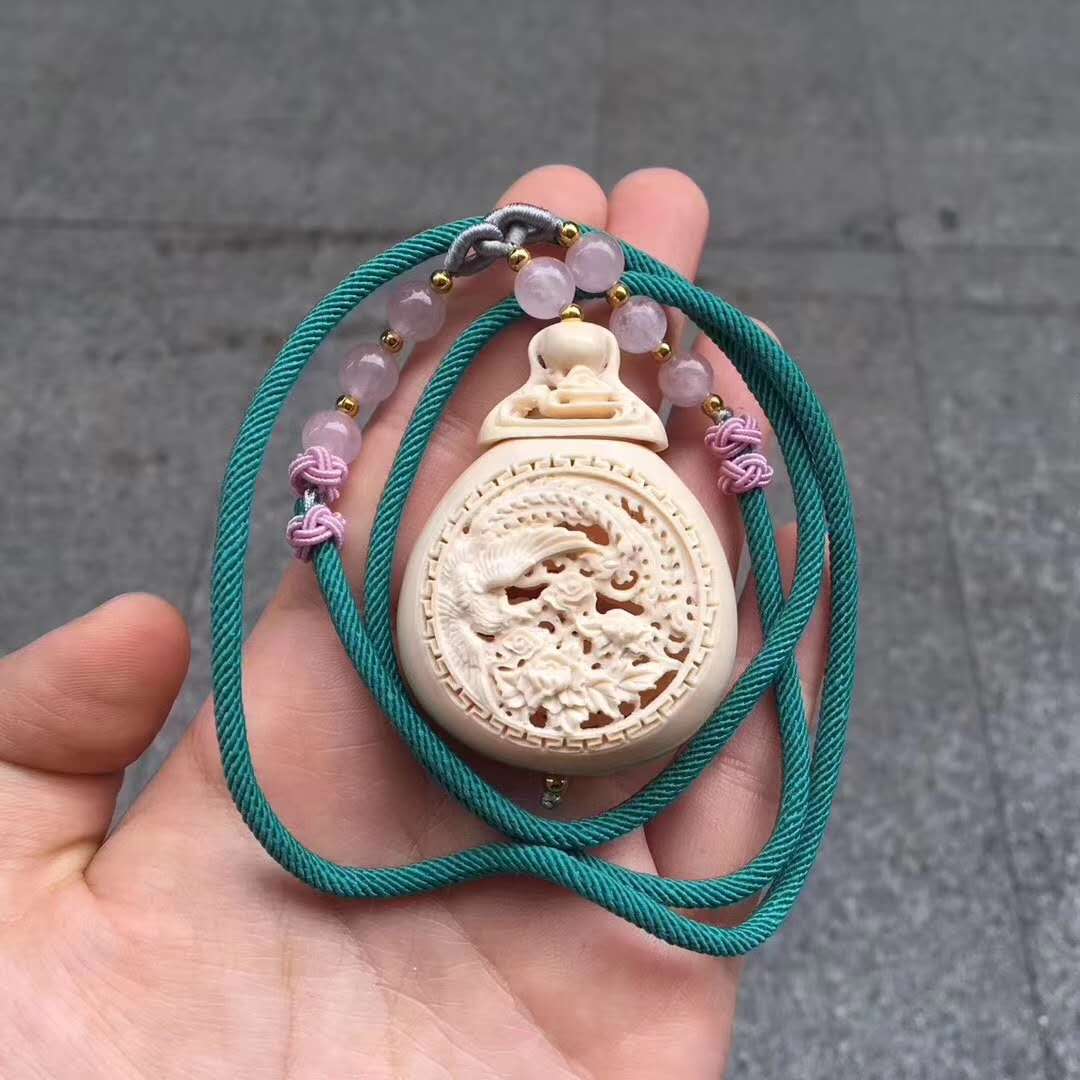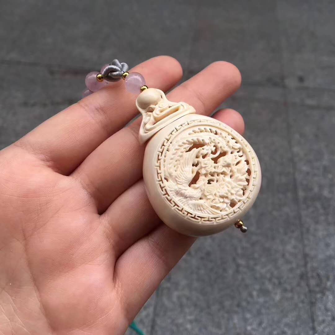 精工鳳戲牡丹香囊,牙質(zhì)白冰細(xì)膩,工藝極致鏤空,細(xì)節(jié)無可挑剔。鳳凰--百鳥之王 嬉戲,百花之王――牡丹,寓意是萬物歡欣,百鳥朝賀,象征天下太平,四海同春。規(guī)格:38×51×18mm,凈重約:13克!