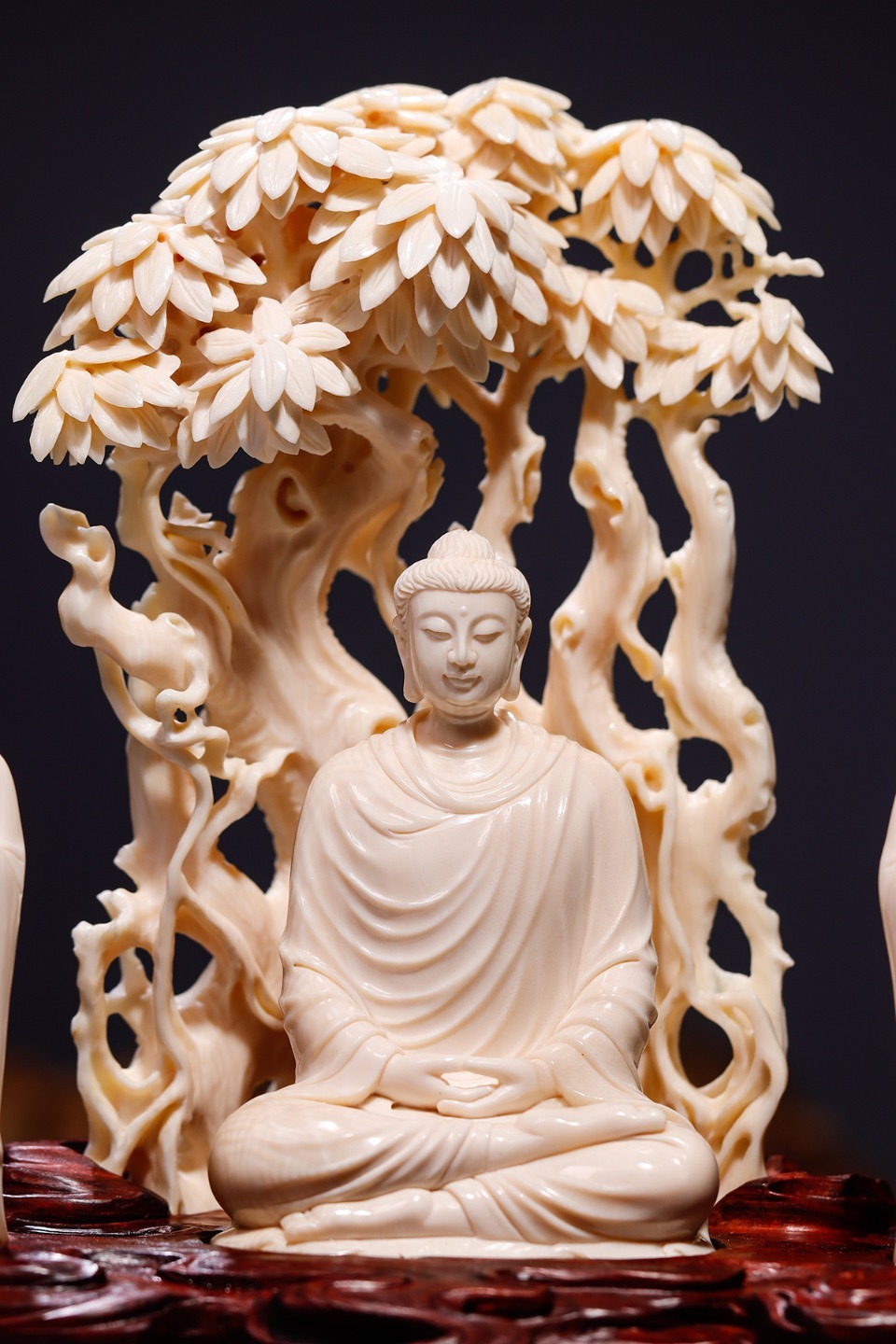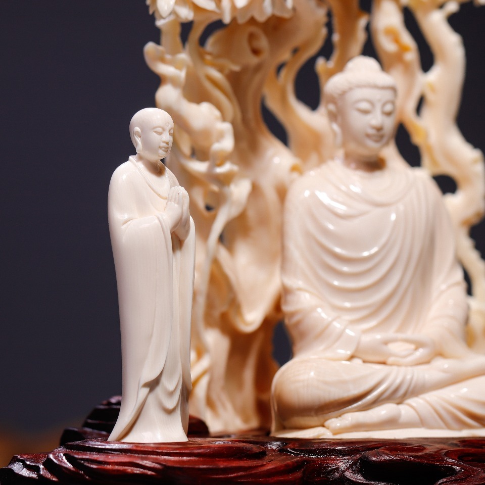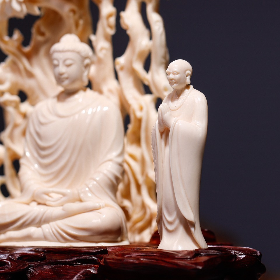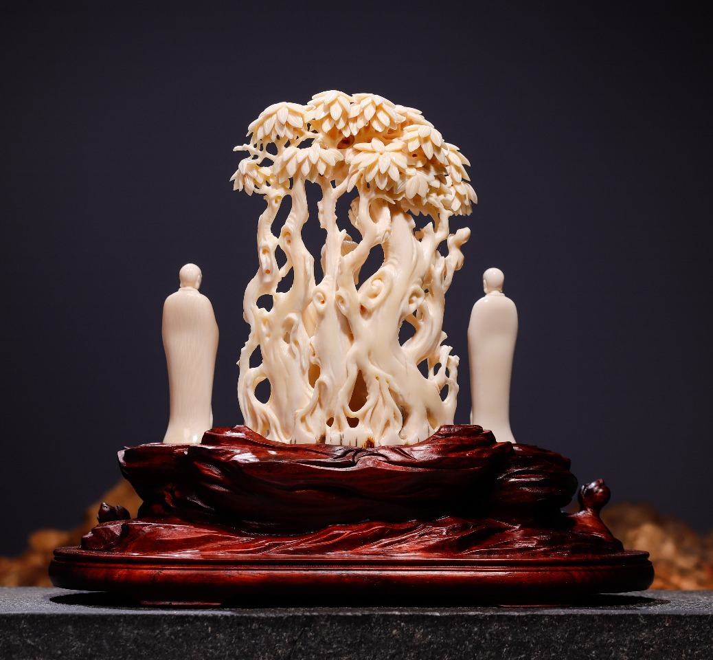 精選頂級猛犸牙冰料,手工立體精雕細琢,采用鏤空手法,細節精美細膩,作品意境深遠,配印度小葉紫檀手雕底座,意境深遠,禪意十足,可謂收藏級精品。
